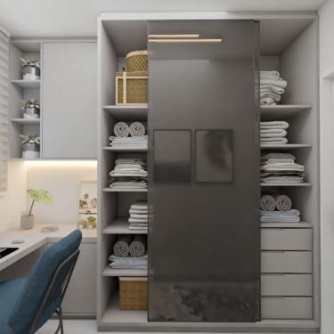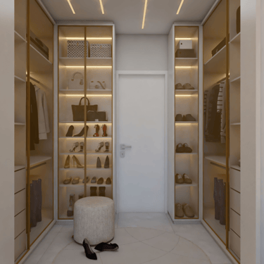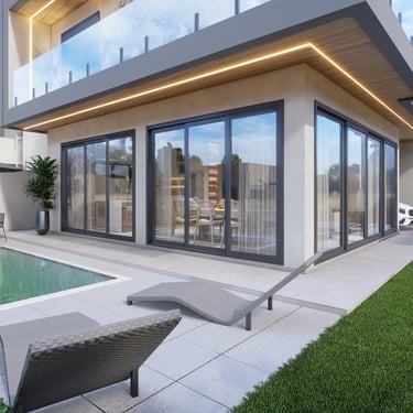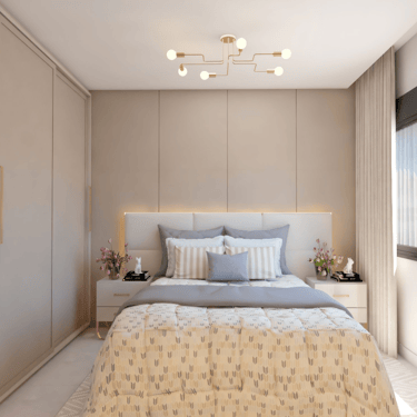 Esquadrias com perfil em alumínio e persiana integrada automatizada nos quartos;